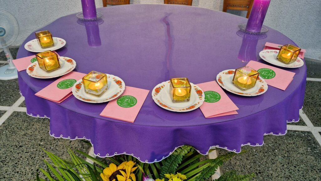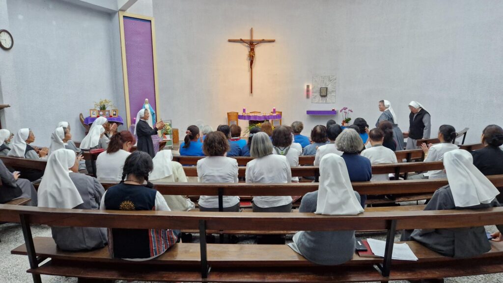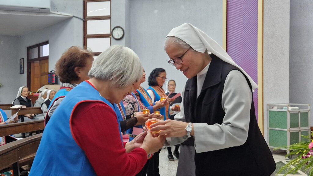Die 6 Frauen wurden im Rahmen der Vesper als Mitglieder aufgenommen. Sr. Andy rief sie mit Namen und Sr. Michelle Huang überreichte ihnen ein Licht. Nach dem Franziskusgebet „Herr, mache mich zu einem Werkzeug deines Friedens“ stellten die Frauen die Kerzen auf den Altar.
